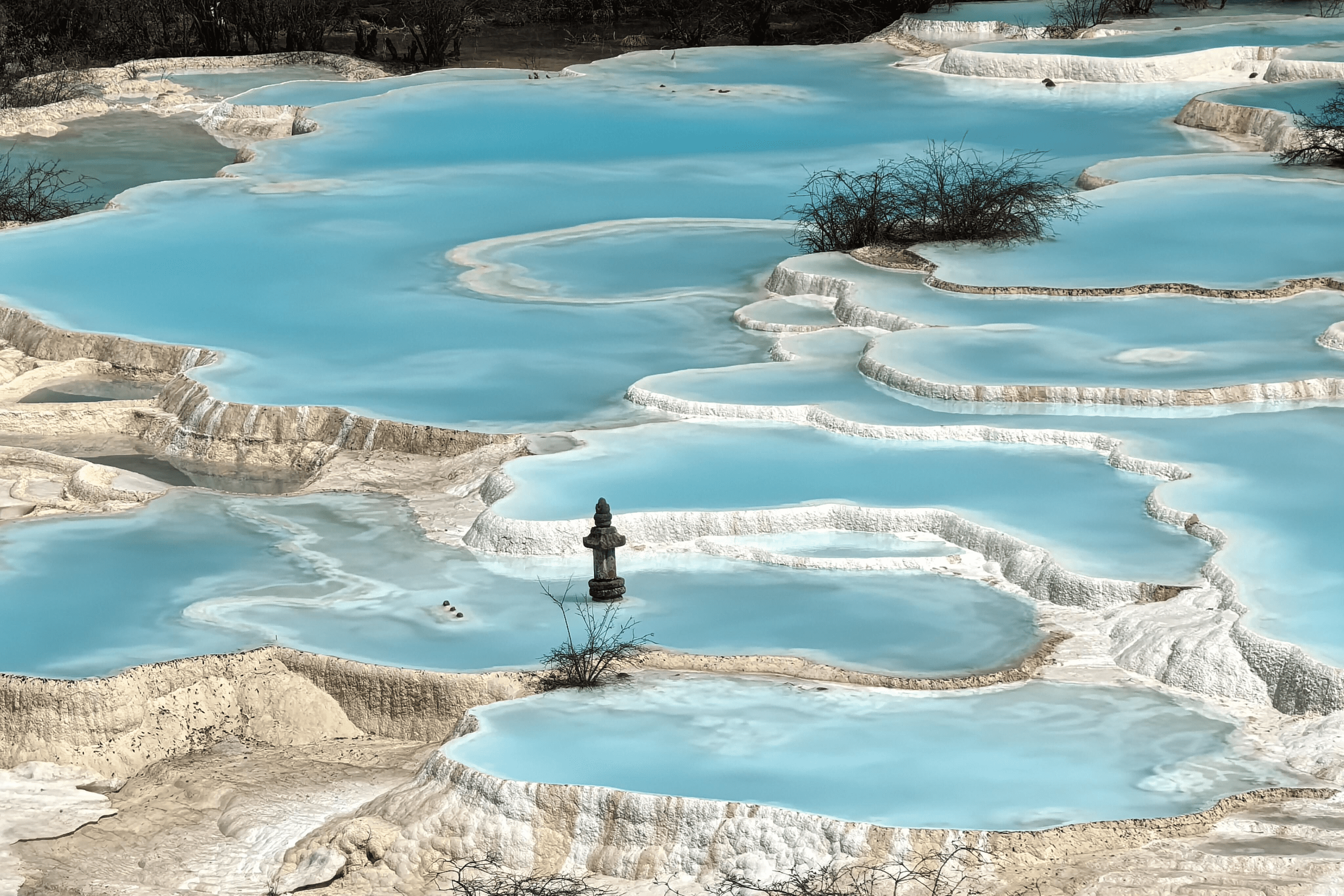 Alpine snowmelt and karst spring water create milky-yellow travertine slopes resembling a colossal golden dragon, giving the name “Huanglong.”